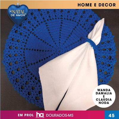 12 Guardanapos em tecido linhão de cor branco, com cantos mitrado medindo 51x51cm; 12 sousplast feitos a mão, crochê linha Cléia na cor azul royal; 12 porta-guardanapos feitos a mão, crochê linha Cléia na cor azul royal